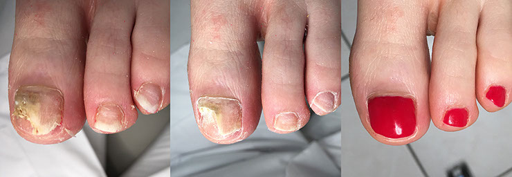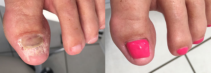 SPECIALISTISCHE TECHNIEKEN Nagelreparatie Nagelreparatie is bedoeld voor het behandelen van schimmelnagels, traumanagels en nagels die door verkeerd knippen de neiging krijgen in te groeien omdat het nagelbed hoger komt te liggen dan de nagel. Door het plaatsen van een laagje gel wordt de nagel geleid, waardoor het nagelbed niet omhoog komt en de nagel weer over het nagelbed heen gaat groeien. Op deze manier wordt opnieuw ingroeien voorkomen. Wanneer bij schimmelnagels de nagel zodanig is aangetast dat de aangedane nagel verwijderd moet worden, is het mogelijk om de nagel te vervangen door een gel-nagel. De gel is elastisch en daardoor geschikt om een nagel mee te repareren. De nagel gedraagt zich net als een gewone, gezonde nagel. Een gel-nagel wordt geplaatst bij: - een ingroeiende teennagel - een gescheurde teennagel - verfraaien van een mycose-nagel (schimmel) - vervangen van een gedeeltelijk ontbrekende nagel Nagelbeugels Nagelbeugeltechniek is een specialistische techniek voor het reguleren van ingroeiende nagels. Ingroeiende nagels ontstaan vaak door het foutief knippen van de nagels. Maar ook convexe (bolstaande) nagels hebben nogal eens de neiging om in te gaan groeien. Het lukt niet altijd om een ingroeiende nagel op een klassieke manier te verhelpen. Om toch tot een oplossing te komen, wordt in dergelijke gevallen een beugel over de ingroeiende nagel geplaatst, zodat de nagelhoeken weer omhoog komen uit de nagelwal en de nagel weer op een normale manier kan uitgroeien. De PURE pedicure werkt met twee soorten beugels, de Gouden Spange en het Veertje: • Gouden Spange: een veelzijdige nagelbeugel die zowel bilateraal (aan beide zijden), unilateraal (aan één zijde) en als plakbeugel gezet kan worden • Veertje: dit is een stalen beugel waar twee oogjes aan worden gemaakt. Deze beugel wordt op maat gemaakt en over de vrije nagelrand geschoven. Doordat ook hier het staal aan de nagelranden gaat trekken, zal de nagel worden gecorrigeerd Orthesiologie Deze specialisatie is van belang voor het ontlasten van diverse drukplekken, vooral aan en tussen de tenen. Een voorbeeld hiervan is een likdoorn tussen twee tenen die telkens terugkomt. Om dit op te lossen wordt een teenspreider geplaatst met daarin een uitsparing voor de likdoorn. Op deze manier kan het terugkeren van de likdoorn worden uitgesteld of voorkomen. Anti-druktechniek Anti-druktechniek is een techniek die wordt toegepast om pijnklachten direct te verminderen of om een wond drukvrij te kunnen leggen. Pijnlijke drukplekken op of onder de voeten en/of tenen kunnen tijdelijk drukvrij worden gelegd, bijvoorbeeld als sprake is van: • eeltvorming • likdoorns • ingroeiende teennagels • Hielspoor • Hallux valgus Drukplekken kunnen pijn veroorzaken door bijvoorbeeld een ontsteking van binnenuit of pijn die van buitenaf veroorzaakt wordt door de schoenen. Er kunnen verschillende middelen worden gebruikt om pijnlijke plaatsen te verzachten en om een lichte correctie toe te passen, zoals vilt, fleecy web of foam. Hiermee wordt de pijnlijke plek ontlast, zodat deze rust krijgt en beter kan herstellen. Anti-druktechniek is een tijdelijke oplossing. Bij eventueel aanhoudende klachten kunt u worden doorverwezen naar een arts op podotherapeut.